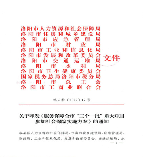 今年以来,洛阳市人社局、市社保中心经过县区调研、座谈了解、征求意见,联合市住建局、市应急管理局等12部门印发了《服务保障全市“三个一批”重大项目参加社会保险实施方案》。在全省范围内,首家由12部门联合重点保障“三个一批”重大项目,创新提出“管行业必须管社保、管业务必须管社保、管生产经营必须管社保”的理念,明确方向路径和工作举措,找准症结破解难题。通过建立部门联动机制,明晰行业部门工作职责。由行业主管部门负责加强对本领域社保工作的宣传、督查督办,及时督促新开工和已投产的“三个一批”重大项目企业参加社会保险,尤其是为建设项目工地农民工优先参加工伤保险,坚决杜绝建设项目“未参保先开工”“只施工不参保”的现象,形成维护全体职工和农民工社会保障权益的合力。