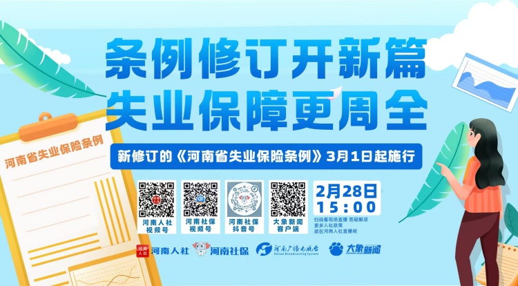 新修订的《河南省失业保险条例》将于2025年3月1日起施行。失业保险覆盖范围有哪些变化?待遇标准如何调整?异地失业如何线上申领?……2月28日下午3点,省人社厅失业保险处四级调研员黄伟为您解疑答惑!